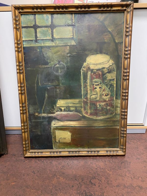 Durch ein vergittertes Fenster dringt nur spärlich Licht in den Kellerraum, in dem sich auf einer Holzkiste ein großes Einmachglas mit einem abgetrennten menschlichen Kopf befindet. Daneben liegt ein einfacher Handbesen wie zur Verharmlosung der makabren Szenerie. Das Etikett auf dem Glas zeigt die Jahreszahl 1969, ein aufgeklebter Zettel auf der Kiste mit der Namensnennung des Künstlers ersetzt die Bildsignatur. Der Schädel im Glas steht auf dem Kopf, er wirkt erschreckend morbid.