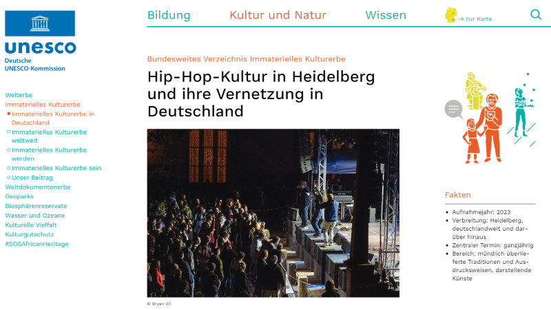 Heidelberg ist eine der zentralen Städte des deutschsprachigen Hip-Hop. Die besondere Bedeutung Heidelbergs in der Hip-Hop-Kultur hat nun die deutsche UNESCO-Kommission gemeinsam mit der Kultusministerkonferenz in besonderer Art und Weise gewürdigt: Der Heidelberger Hip-Hop wird in das bundesweite Verzeichnis des Immateriellen Kulturerbes aufgenommen. „Aufgrund der historischen Rolle Heidelbergs gilt die Stadt als Erinnerungsort für die Entwicklung der deutschsprachigen Hip-Hop-Kultur. Sie zeichnet sich durch ihren offenen Partizipationscharakter und eine breite Vernetzung in Deutschland aus“, heißt es zur Begründung. Den Antrag zur Aufnahme in das Verzeichnis hatte die Stadt Heidelberg im Jahr 2021 gemeinsam mit Akteuren aus der Hip-Hop-Szene, allen voran der Hip-Hop-Forscher Bryan Vit, gestellt.