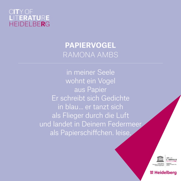 Im Dezember 2017 startete erstmals die ganzjährige Aktion „Poesie unterwegs". Seitdem sind jährlich vermehrt und wortwörtlich Gedichte und Gedanken von Heidelberger Autorinnen und Autoren in der UNESCO-Literaturstadt unterwegs, in diesem Jahr in Form von Postkarten. Aktuell sind sie in Aufstellern in den bereits geöffneten Heidelbergs Bars und Institutionen zu finden und laden zur Mitnahme ein. Alle ausgewählten Texte samt weiterer Informationen zu den insgesamt 43 teilnehmenden Autorinnen und Autoren können auch auf der Homepage der Stadt Heidelberg nachgelesen werden.