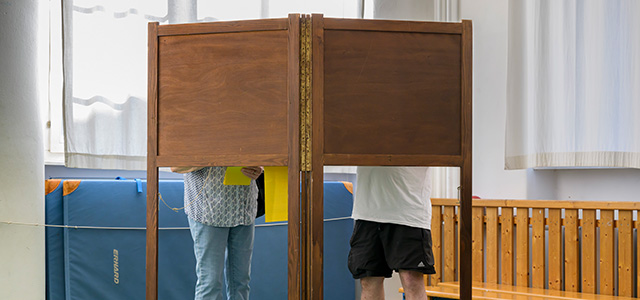 Zwei Menschen stehen verdeckt hinter einer Wahlurne.
