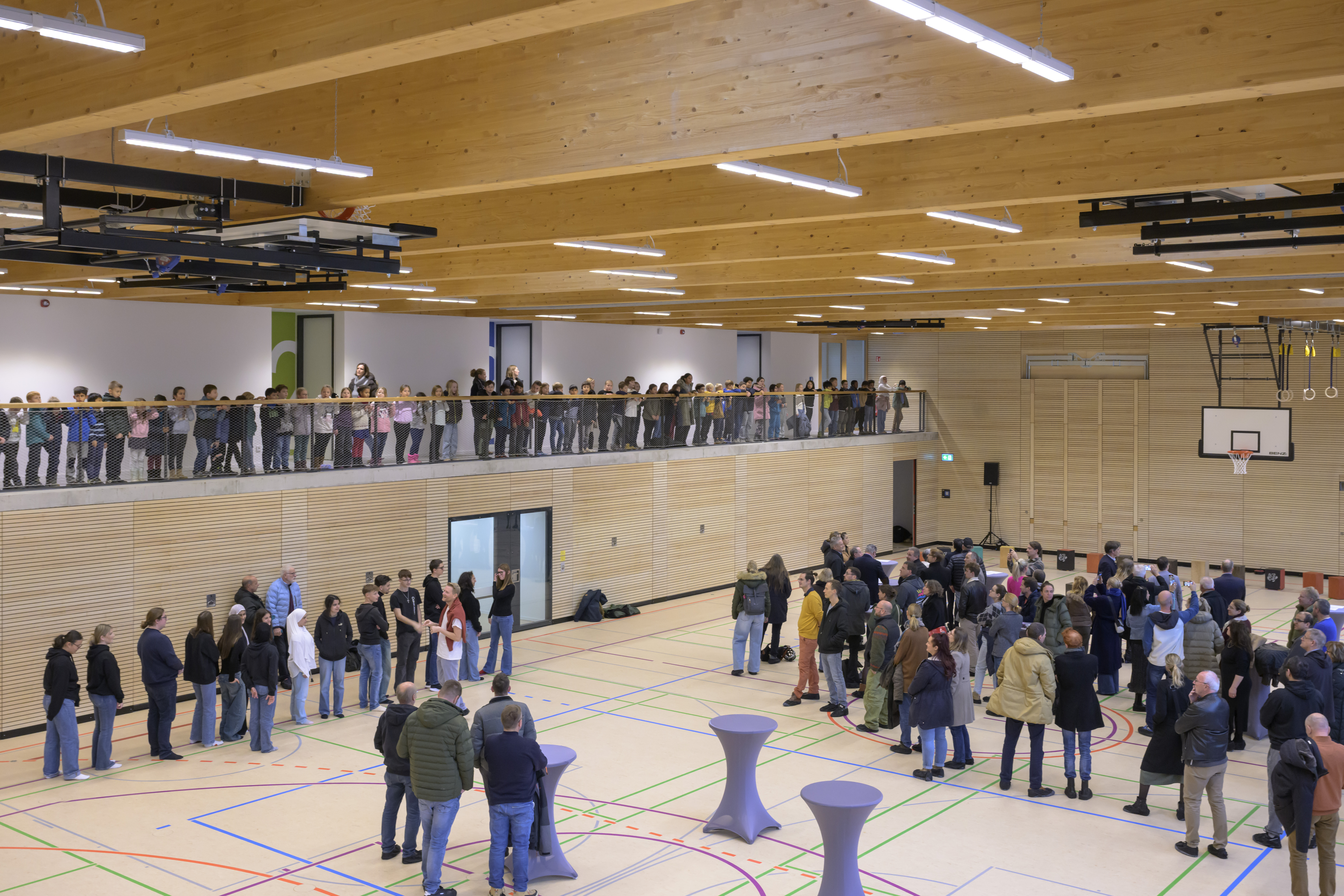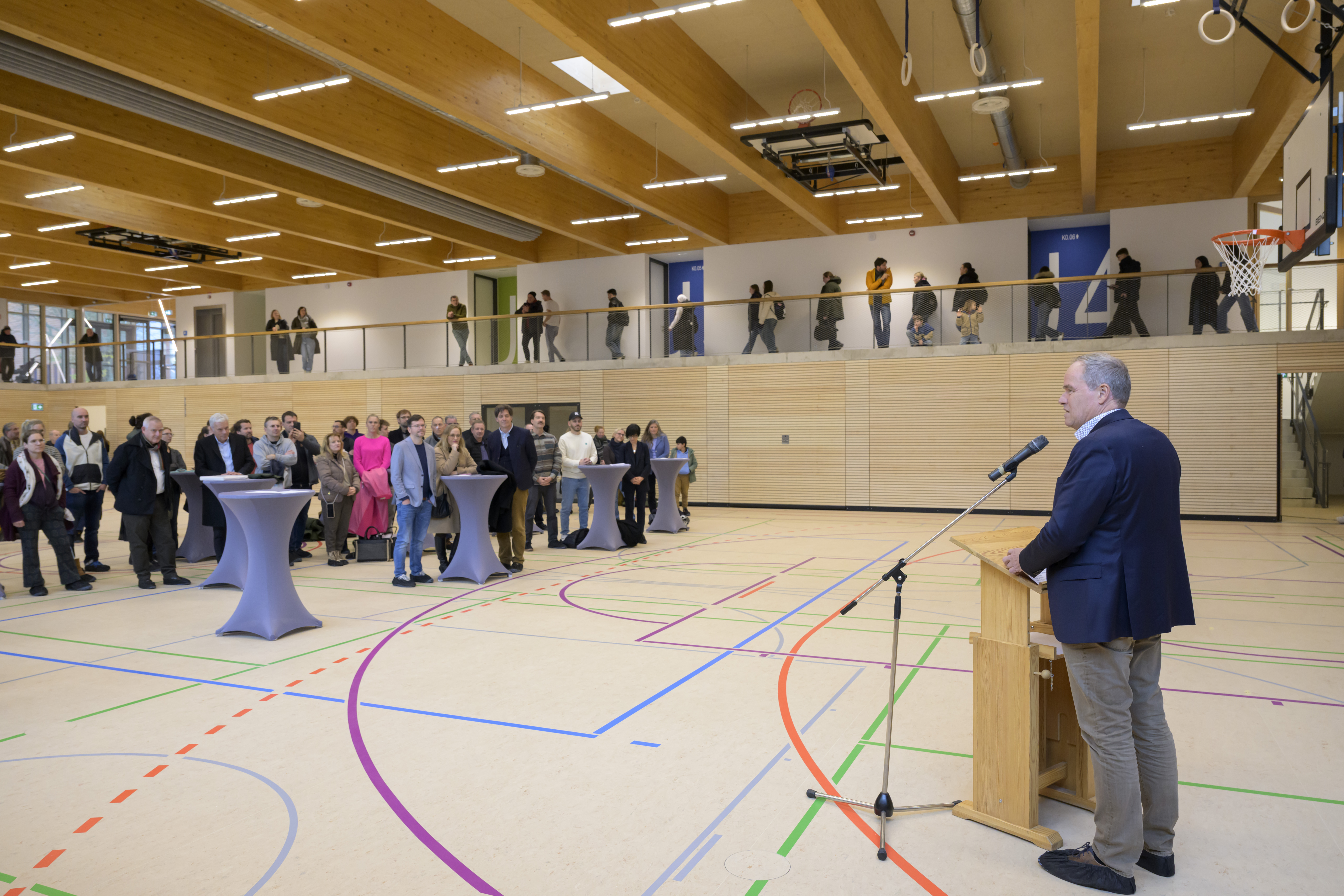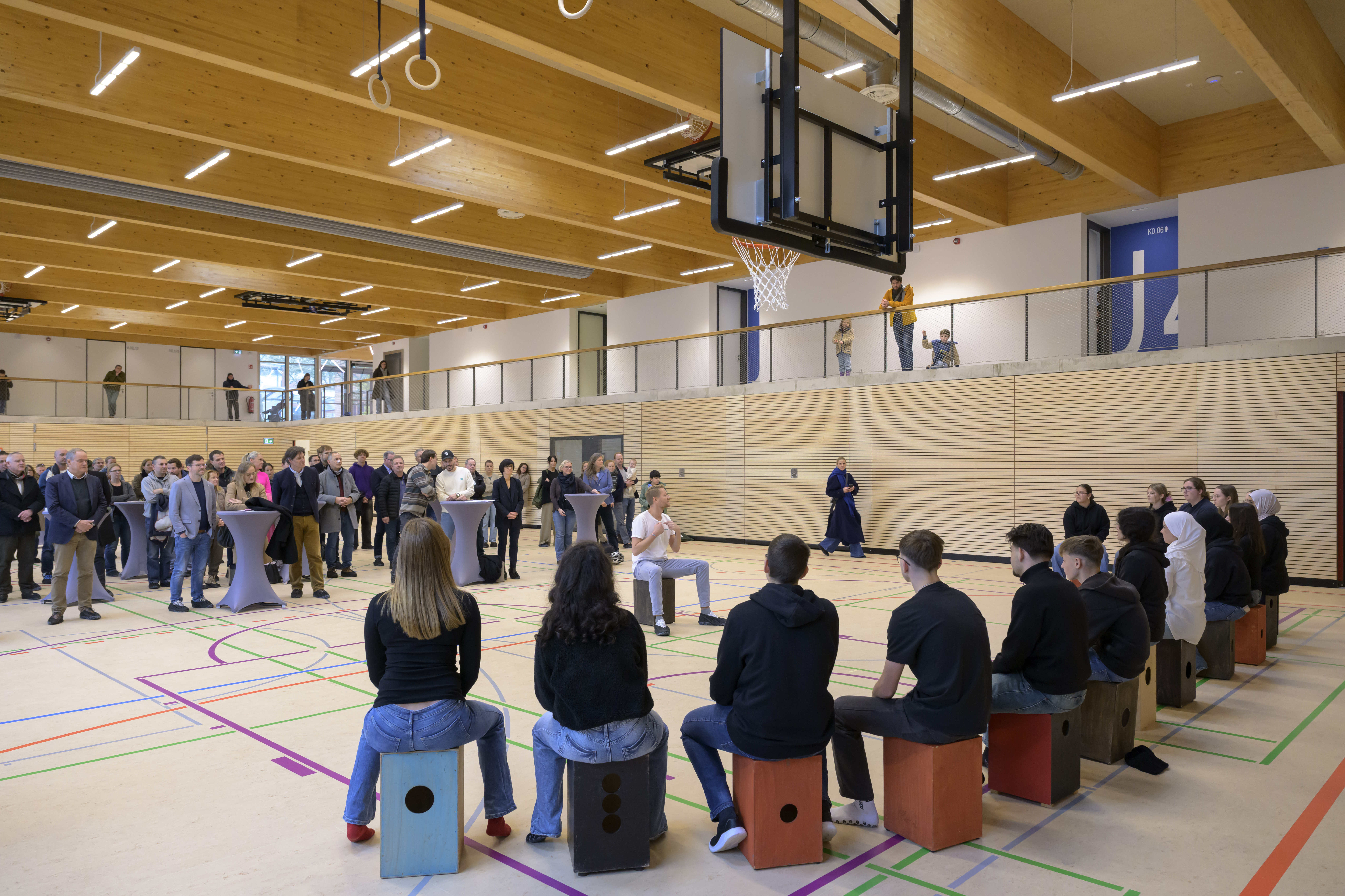 Bürgermeisterin und Bildungsdezernentin Stefanie Jansen ergänzte: „Diese Halle bietet nun Raum und attraktive Bedingungen für vielfältige Sportarten, für inklusiven Unterricht und für die Förderung von Bewegungsfreude – egal, ob in der Schule oder danach im Verein. Ich bin sicher: sehr viele junge Menschen profitieren davon, ganz unabhängig von Leistungsniveau oder Hintergrund.“