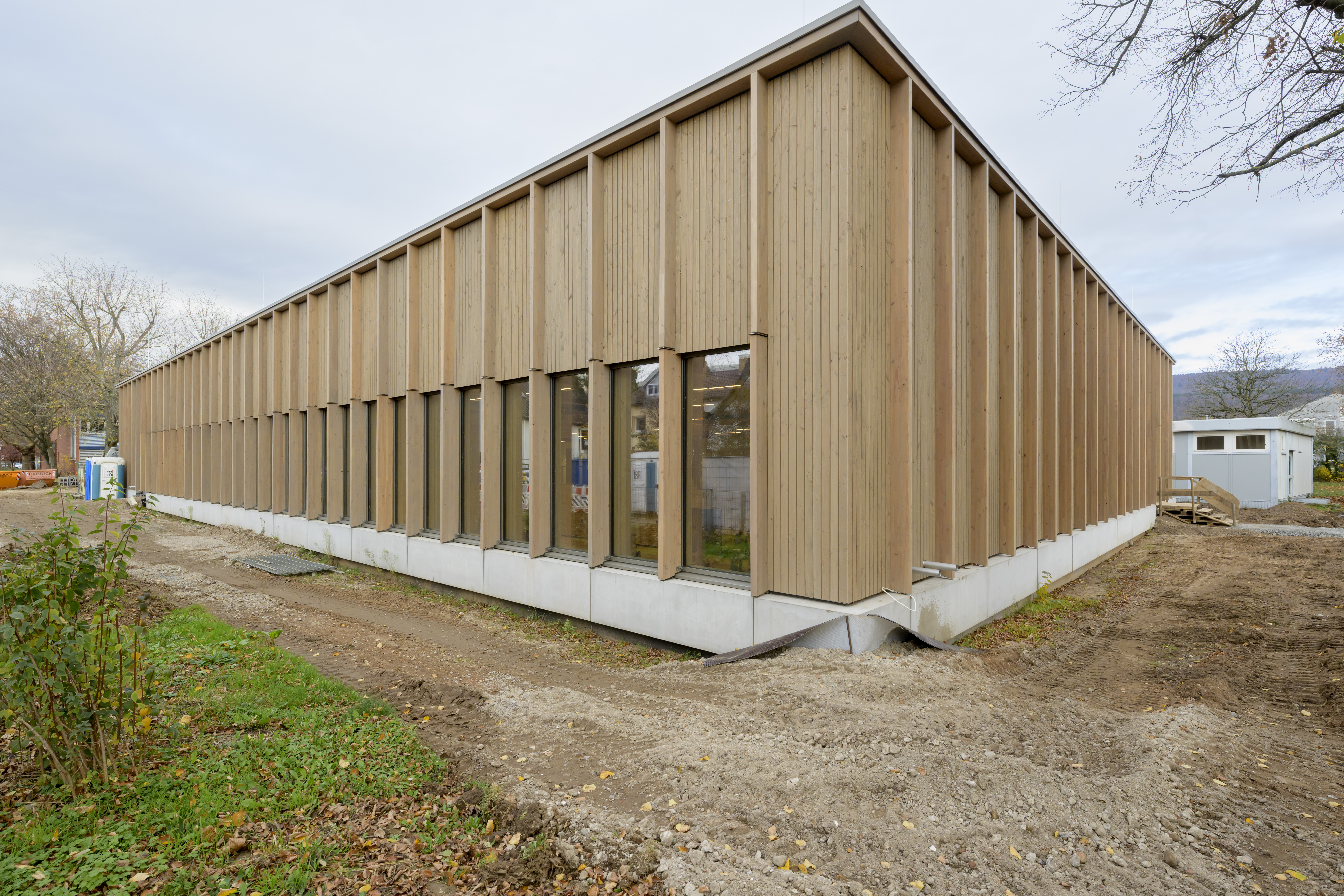 Der Neubau wurde in Holzhybrid-Bauweise errichtet: Das Untergeschoss sowie erdberührende Bauteile bestehen aus Stahlbeton, während das Tragwerk im Obergeschoss aus Holz gefertigt ist. Außen- und Innenwände wurden in Holzrahmenbauweise ausgeführt. Eine vertikale Brettschalung aus Douglasie prägt das Erscheinungsbild der Fassade. Große Fenster nach Westen und acht Oberlichter sorgen für viel Tageslicht. Ergänzt wird das nachhaltige Konzept durch eine Photovoltaik-Anlage auf dem Dach, eine Luftwärmepumpe zur Beheizung sowie eine Fußbodenheizung in den Nebenräumen.