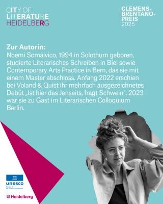 Der mit 10.000 Euro dotierte Clemens-Brentano-Preis für Literatur der Stadt Heidelberg ging 2025 an die in Bern lebende Autorin Noemi Somalvico. Sie nahm den Preis für ihren Erzählband „Das Herz wirft in der Brust keinen Schatten“ (Voland & Quist, 2024) Im Rahmen einer Feierstunde aus den Händen von Bürgermeisterin Martina Pfister im Spiegelsaal des Gebäudes Prinz Carl entgegen. Die Laudatio hielt der F.A.Z.-Redakteur Jan Wiele. Musikalisch wurde die Verleihung umrahmt durch die Cellistin Dorothea von Albrecht.