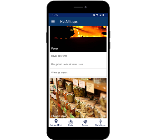 Ergänzt wird dieses Informationsangebot über detaillierte Hinweise, wie man sich in verschiedenen Notsituationen richtig verhält oder sich im Vorfeld vorbereiten kann.