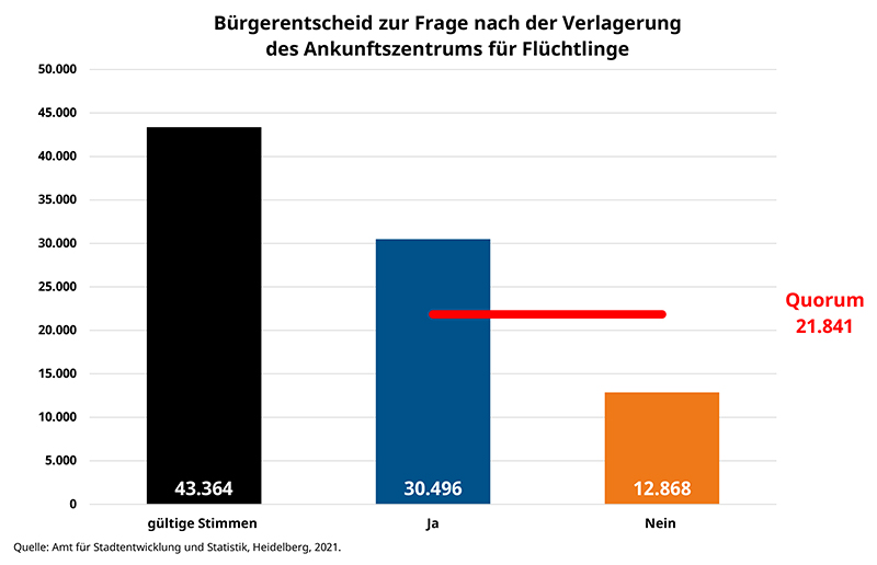 Oberbürgermeister Prof. Dr. Eckart Würzner verkündete das vorläufige amtliche Endergebnis um 19.33 Uhr pandemiebedingt per Livestream aus dem Neuen Sitzungssaal des Heidelberger Rathauses. Die Wahlbeteiligung lag demnach bei 39,86 Prozent. 43.364 Bürgerinnen und Bürger gaben eine gültige Stimme ab. Davon votierten 12.868 (29,7 Prozent) mit „Nein“ auf die Frage „Sind Sie gegen eine Verlagerung des Ankunftszentrums für Flüchtlinge an das Autobahnkreuz auf die landwirtschaftlich genutzte Fläche Wolfsgärten?“. 30.496 (70,3 Prozent) kreuzten das „Ja“ auf dem amtlichen Stimmzettel an.