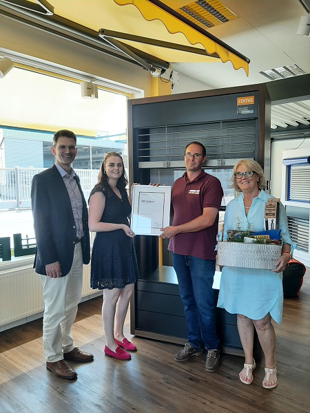 Die Georg Gutfleisch GmbH bietet Rollladen, Raffstoren, Textilscreens, Klappläden und Innenbeschattungen sowie elektrische Antriebe an. Früher wurden Holzrollladenleisten am Standort noch selber produziert. Im Laufe der Jahre wurden die Produkte um Markisen und diverse weitere Sonnenschutzprodukte in Maßarbeit erweitert. Direkt vor Ort gratulierten Marc Massoth, Leiter des Amtes für Wirtschaftsförderung und Wissenschaft, sowie Katharina Püschel aus der Abteilung für Standortentwicklung und Unternehmensservice Marcus Schmitt und seiner Mutter Monica. Sie überbrachten auch Glückwünsche von Oberbürgermeister Eckart Würzner in Verbindung mit einer Urkunde. Als Geschenk gab es ein bunt gemischtes Paket zum Grillen. Marc Massoth und Katharina Püschel nutzten den Besuch, um sich umfassend über das Unternehmen zu informieren. Dabei wurden ihnen auch die neuesten technologiebasierten Markisen und Rolläden gezeigt und welche vielfältigen Einsatzmöglichkeiten es gibt. Die Wirtschaftsförderung wünscht der Georg Gutfleisch GmbH für die Zukunft alles Gute!