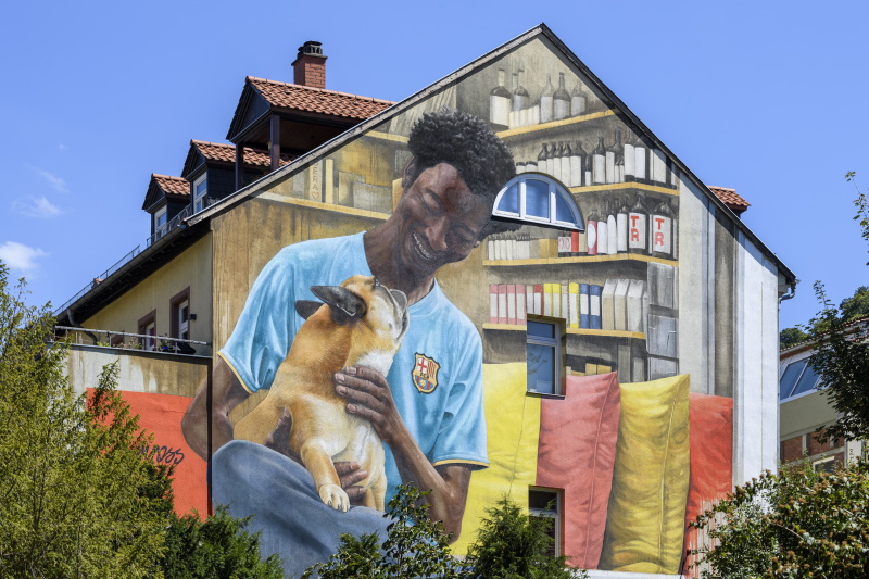 Das Wandgemälde hat einen besonderen Bezug zur Plöck und ihren Geschäften und Bewohnern. Das Motiv zeigt eine reale Straßenszene vor einem nahegelegenen Geschäft in der Plöck: ein junger Mann, der vor dem Laden sitzt und dem der Hund der Geschäftsinhaberin freudig auf den Schoß springt. Ein Foto dieses Momentes diente als Vorlage für das große Wandgemälde.