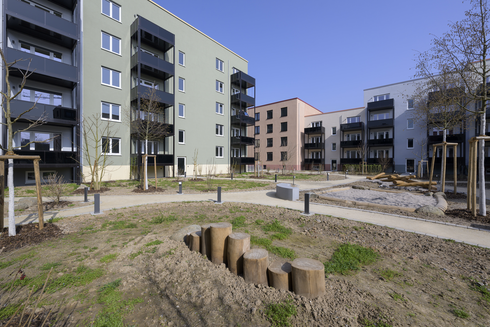 Die neuen Häuser der GGH auf dem Hospital-Areal haben jeweils eine individuelle Fassade und liegen an begrünten Innenhöfen, die Treffpunkte für die neuen Bewohnerinnen und Bewohner bilden. (Foto: Philipp Rothe)