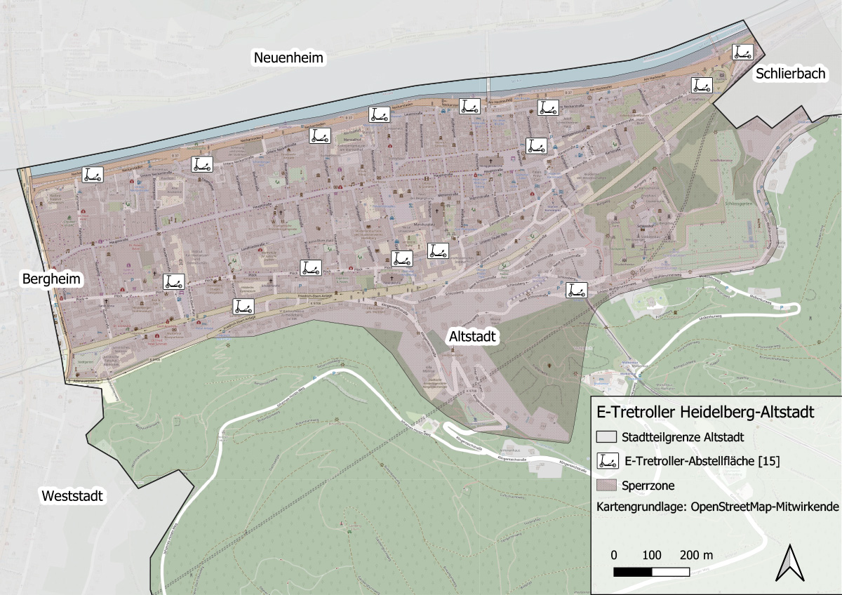 Die Stadt Heidelberg hat sieben neue E-Tretroller-Abstellflächen in der Altstadt ausgewiesen. Mit diesen werden mehrere Netzlücken geschlossen und die bisherigen acht Abstellflächen entlastet. Um die neuen Flächen auch im System der E-Tretroller-Anbietenden zu hinterlegen, wurden die Standorte nicht nur eingezeichnet, sondern auch digital übergeben. Das bedeutet: Mit der technischen Übernahme sind diese ab sofort zur Nutzung freigegeben und verbindlich.