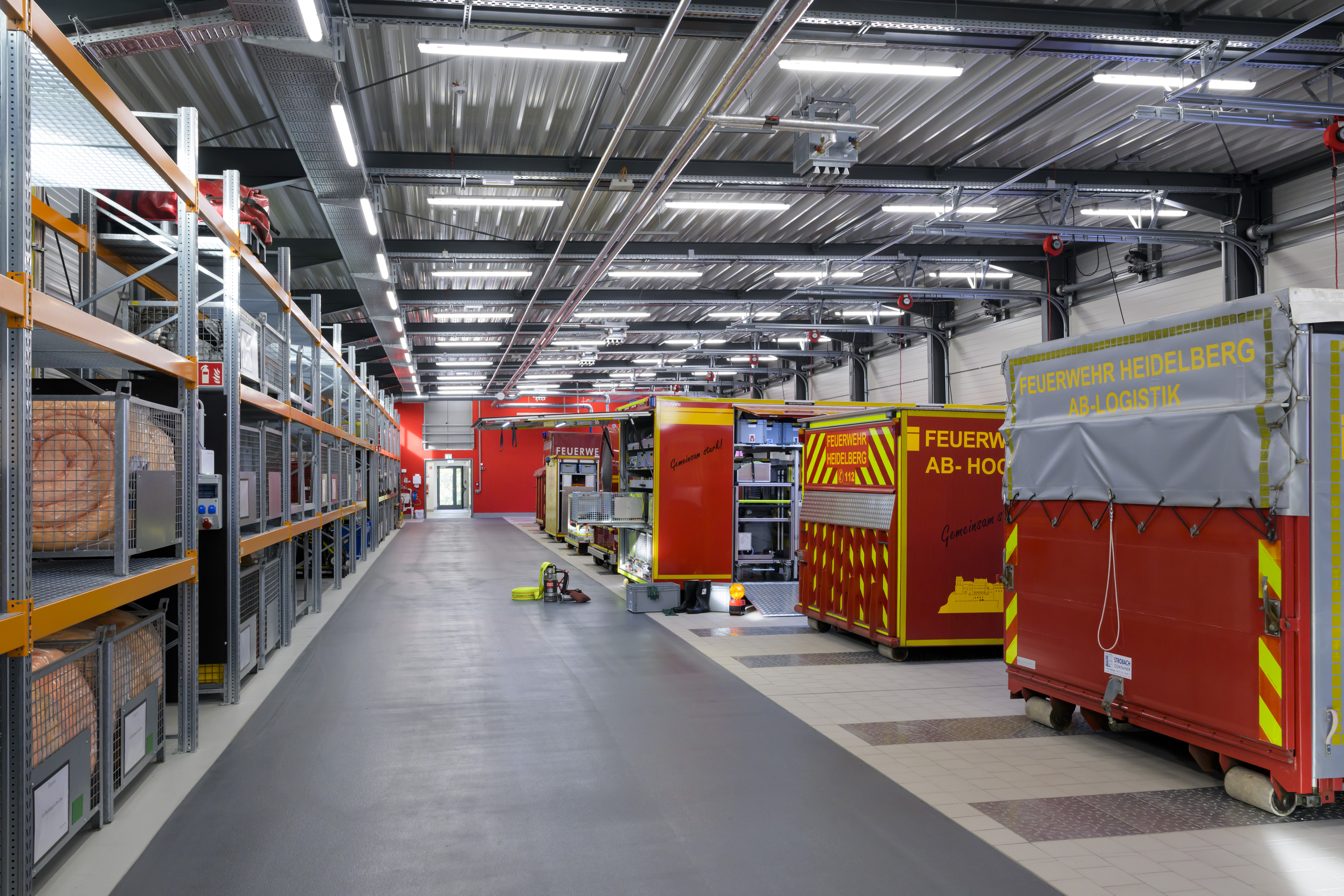 Die zwölf Abrollbehälter enthalten Spezialausrüstung, beispielsweise für Gefahrguteinsätze und bei Ölverschmutzungen in Gewässern oder Sonderlöschmittel für außergewöhnliche Brandeinsätze. Bei Bedarf werden sie auf einen Lastwagen geladen und zum Einsatzort gebracht. Bislang mussten die Abrollbehälter im ungeschützten Außenbereich der Feuerwache lagern. Der fehlende Witterungsschutz wirkte sich negativ auf den Werterhalt der insgesamt rund 850.000 Euro teuren Spezialausrüstung aus. Erschwerend kommt hinzu, dass im Winter Teile der Ausrüstung entnommen und frostsicher in der Feuerwache gelagert werden mussten. Behälter im Freien mussten bei Schnee und Eis zeitaufwendig von diesen befreit werden. In einem Palettenregal entlang der Rückseite des Neubaus wird das dazugehörige Nachschubmaterial gelagert, was ein zügiges Wiederbestücken der Abrollbehälter nach Einsätzen ermöglicht. Einzelne Ausrüstungsgegenstände können direkt in Transportlastwagen geladen werden, die künftig in der Erweiterungshalle abgestellt werden.