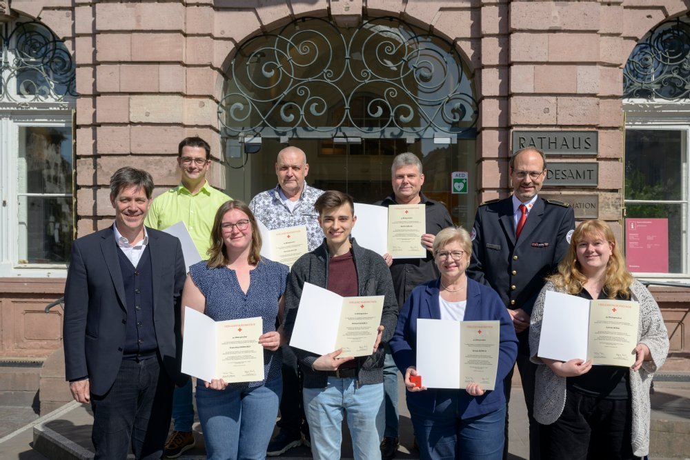 Die Blutspende-Ehrennadel wird in verschiedenen Stufen überreicht: Die Ehrennadel in Gold erhielten bei der Verleihungsveranstaltung im Rathaus Torsten Kern, Christian Bauer und Richard Kneißle für zehn Blutspenden. Die Ehrennadel in Gold mit goldenem Lorbeerkranz für 25 Blutspenden wurde Franziska Ehrhard und Eyleen Böge überreicht. Die Ehrennadel in Gold mit goldenem Eichenkranz wurde Brenda Seppich (50 Spenden) und Ralf Schölch (75 Spenden) verliehen. Zudem erhielten die Geehrten Verleihungsurkunden.
