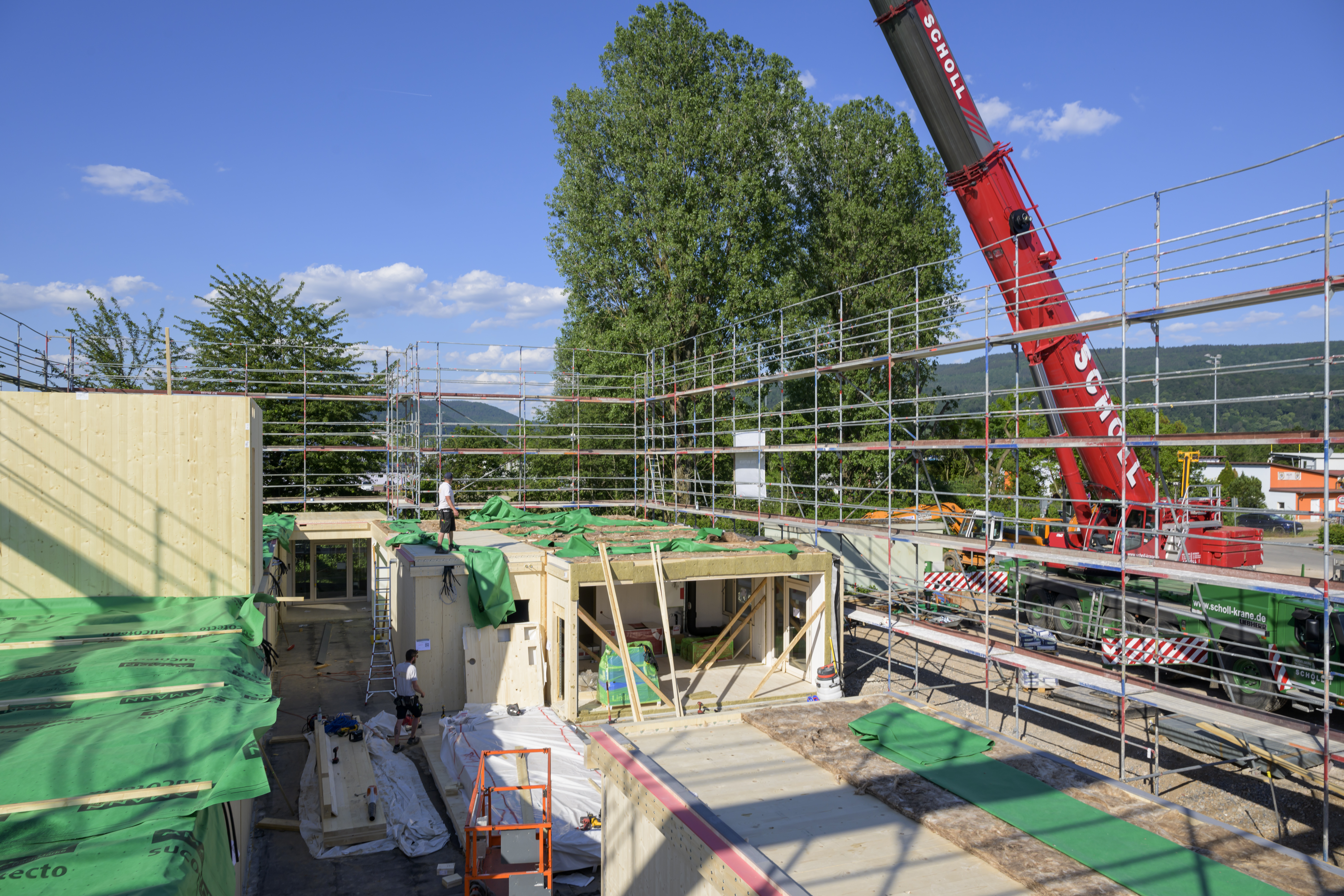 Auf dem städtischen Grundstück Harbigweg 18 wird seit November 2023 (Erdarbeiten) an dem Neubau der Kita Harbigweg gearbeitet. Das Gebäude wird aus rund 60 Holzmodulen in Passivhausbauweise bestehen. Zehn Module sind am Dienstag, 14. Mai 2024, eindrucksvoll „eingeschwebt“. Mittels eines mobilen Krans wurden die rund zwölf Tonnen schweren Module nach und nach zusammengesetzt. Der Neubau wird Platz für die Betreuung von rund 70 Kindern zwischen eins und sechs Jahren bieten.