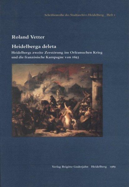 | Heft 1 Roland Vetter: Heidelberga deleta. Heidelbergs zweite Zerstörung im Orléansschen Krieg und die französische Kampagne von 1693. Verlag Regionalkultur & Edition Guderjahn, Heidelberg - Ubstadt-Weiher 2. Auflage 1990. ISBN 3-924973-8 € 9,90 Vergriffen! Ansichtsexemplar im Lesesaal des Stadtarchivs einsehbar. |