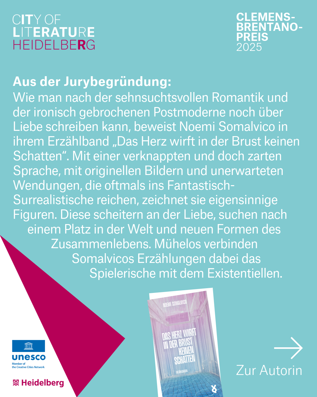 „Wie man nach der sehnsuchtsvollen Romantik und der ironisch gebrochenen Postmoderne noch über Liebe schreiben kann, beweist Noemi Somalvico in ihrem Erzählband ‚Das Herz wirft in der Brust keinen Schatten‘. Mit einer verknappten und doch zarten Sprache, mit originellen Bildern und unerwarteten Wendungen, die oftmals ins Fantastisch-Surrealistische reichen, zeichnet sie eigensinnige Figuren. Diese scheitern an der Liebe, suchen nach einem Platz in der Welt und neuen Formen des Zusammenlebens. Mühelos verbinden Somalvicos Erzählungen dabei das Spielerische mit dem Existentiellen.“