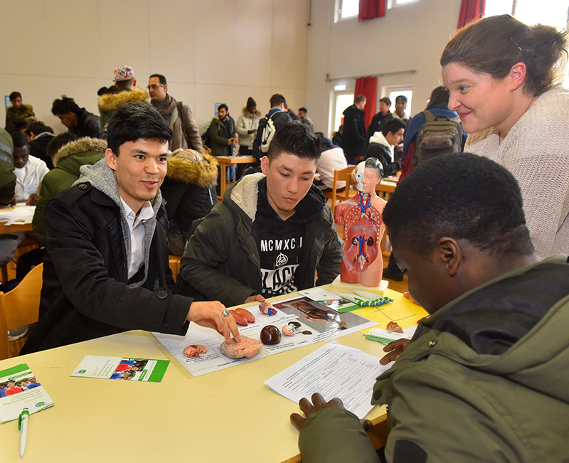 Einen Tisch eindecken, Nägel einschlagen, einscannen, Medikamente sortieren, Werkzeuge bestimmen, Pflastern oder Rohre verlegen: Beim ersten Infotag „Finde deinen Beruf!“ für junge Geflüchtete am Donnerstag, 22. März 2018, testeten knapp 100 junge Menschen ihre Neigungen für verschiedene Ausbildungsberufe. Beim sogenannten „Berufeparcours“ mit 20 Stationen lernten sie in praktischen Übungen zahlreiche Berufe kennen. Im Anschluss bekamen sie an vier Beratungsstationen erste Hinweise, wie sie einen zu ihnen passenden Beruf erlernen können. Für detailliertere Informationen konnten die Teilnehmenden gesonderte Beratungstermine vereinbaren. Die Stadt Heidelberg hatte den Infotag gemeinsam mit Kooperationspartnerinnen und -partnern organisiert. Die meisten der teilnehmenden jungen Geflüchteten sind derzeit im „Vorqualifizierungsjahr Arbeit und Beruf mit Schwerpunkt Erwerb von Deutschkenntnissen“ (VABO) der Heidelberger Berufsschulen.