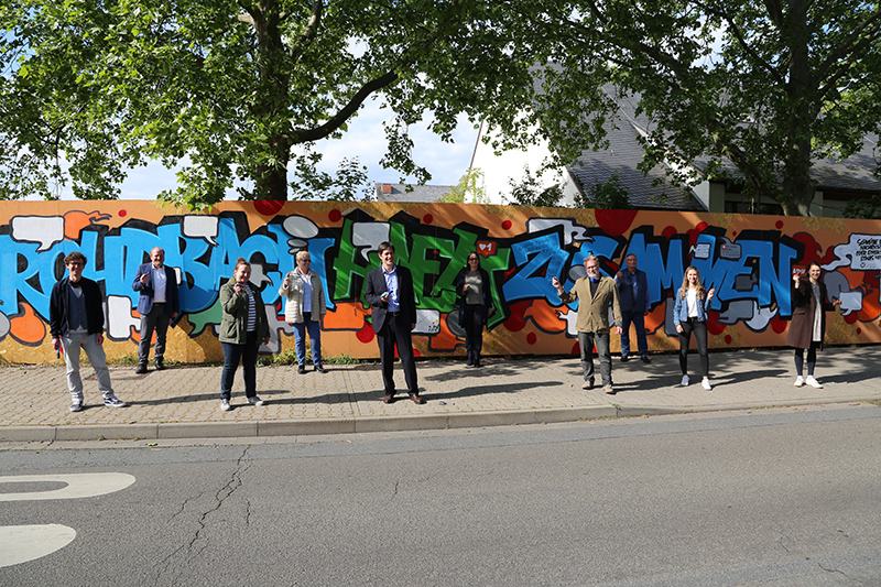 Am Hospital-Gelände können Anwohnerinnen und Anwohner ab sofort auf der „Wand der Solidarität im Hasenleiser“ ihre Grußbotschaften für Nachbarinnen und Nachbarn hinterlassen. An der Kreuzung Freiburger Straße / Karlsruher Straße (B3) haben das Quartiersmanagement Hasenleiser und der Stadtteilverein Rohrbach mit der Genehmigung der städtischen Gesellschaft für Grund- und Hausbesitz aus einer hölzernen Baumschutzwand eine bunte Plattform geschaffen, die das lebendige Miteinander im Quartier fördern soll, das aufgrund der Corona-Pandemie derzeit eingeschränkt ist. Erster Bürgermeister Jürgen Odszuck hat die „Wand der Solidarität“ am Montag, 4. Mai 2020, eingeweiht.
