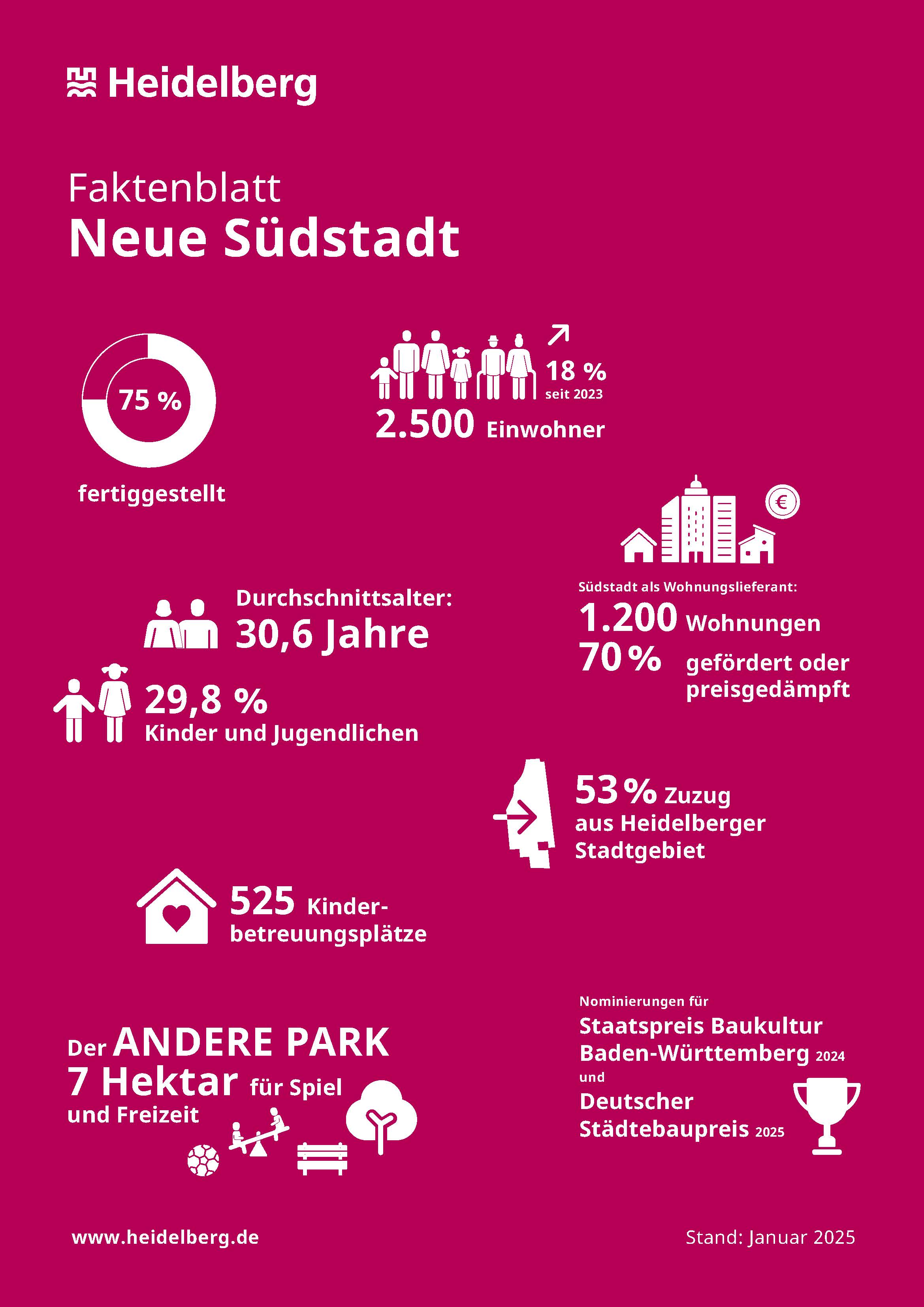 Die neue Südstadt - das sind die Konversionsflächen Campbell Barracks und Mark-Twain-Village. Diese befinden sich im Stadtteil Südstadt zu beiden Seiten der Römerstraße. Mit rund 43 Hektar nehmen diese etwa ein Viertel der Flächen des Stadtteils ein. In der neuen Südstadt leben bereits über 2.500 Menschen. Das sind rund ein Drittel aller Bewohnerinnen und Bewohner der gesamten Südstadt.