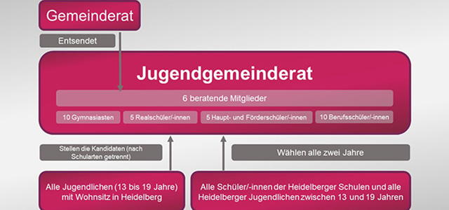 Seit 2006 vertreten Jugendgemeinderätinnen und -räte die Interessen junger Heidelbergerinnen und Heidelberger gegenüber dem Oberbürgermeister, dem Gemeinderat und seinen Ausschüssen. Bei allen jugendrelevanten Themen haben die jungen Räte ein festes Rederecht im Gemeinderat. Gewählt wird das 30-köpfige Gremium alle zwei Jahre von Jugendlichen zwischen 13 und 19 Jahren. Hier geht es zu den aktuellen Jugendgemeinderätinnen und -räten.