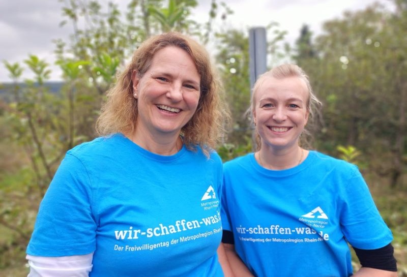 • Zwei lachende Frauen mit blauem wir-schaffen-was-T-shirt