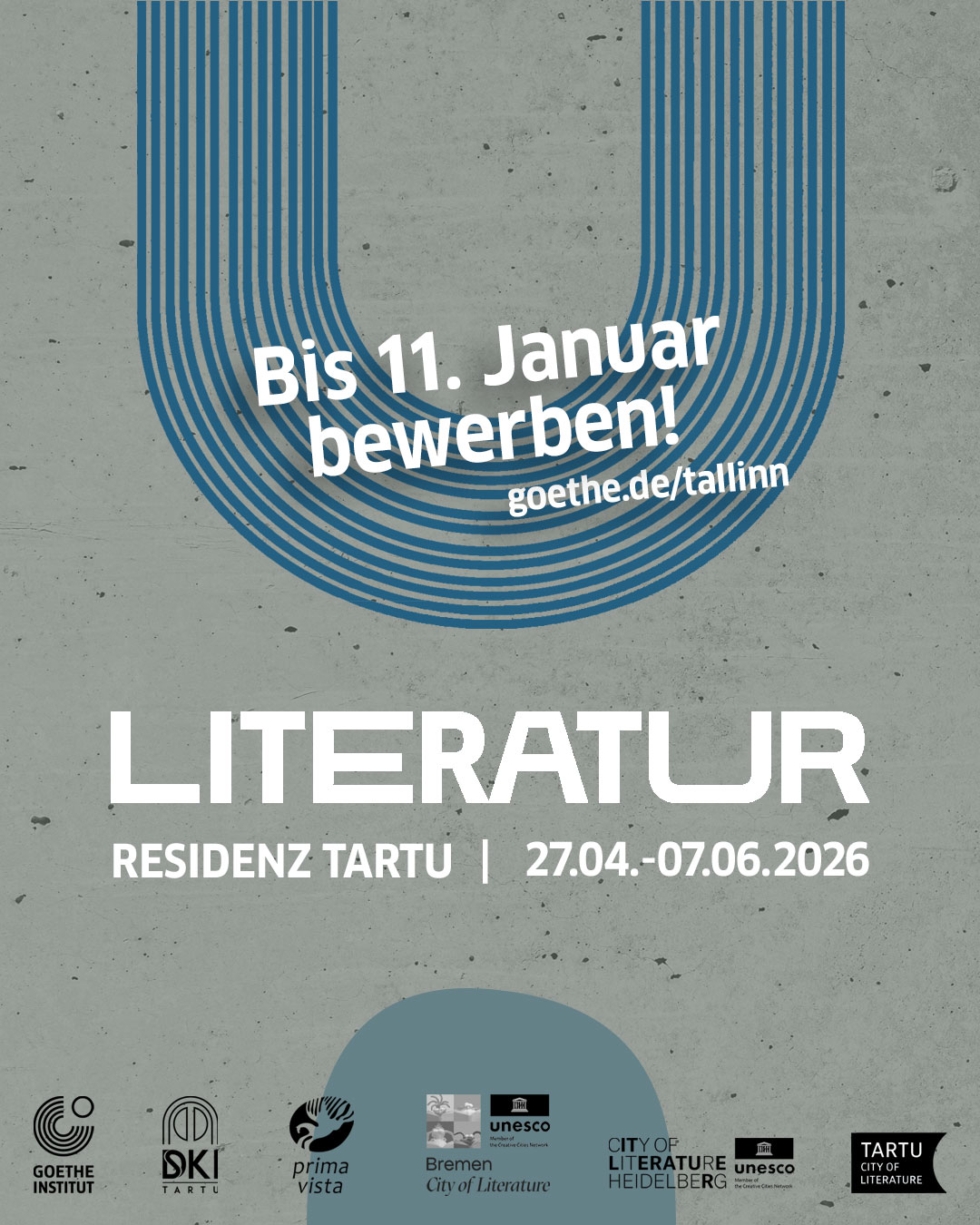 Das Goethe-Institut Tallinn, das Deutsche Kulturinstitut Tartu und das Literaturfestival Prima Vista bieten vom 27. April bis zum 7. Juni 2026 einen Artist-in-Residence-Platz in der UNESCO-Literaturstadt Tartu für Autor*innen und Illustrator*innen der UNESCO-Literaturstädte Heidelberg und Bremen. Das Residenzstipendium umfasst eine Aufwands- und Reisekostenentschädigung sowie eine kostenlose Unterkunft für sechs Wochen vor Ort. Aus den eingegangenen Bewerbungen wird zusätzlich eine weitere Kandidat*in für ein Reisestipendium zwecks Besuchs des Prima-Vista-Festivals ausgewählt.