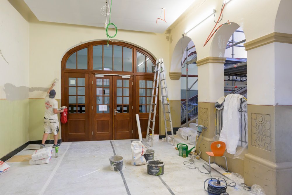 Die Digitalisierung und Innensanierung der Unterrichtsräume der beiden denkmalgeschützten Jugendstil-Schulgebäude wurde bereits 2024 fertiggestellt. In den Sommerferien werden – als letzter Bauabschnitt – die beiden Haupttreppenhäuser der Marie-Marcks- und der Wilckensschule saniert. Hier wird die Elektroinstallation samt Leuchten erneuert, Akustikdeckenfelder montiert und Wände und Decken neu gestrichen. Da hierzu die Treppenhäuser komplett gesperrt werden müssen, war dies während des Schulbetriebs nicht möglich.