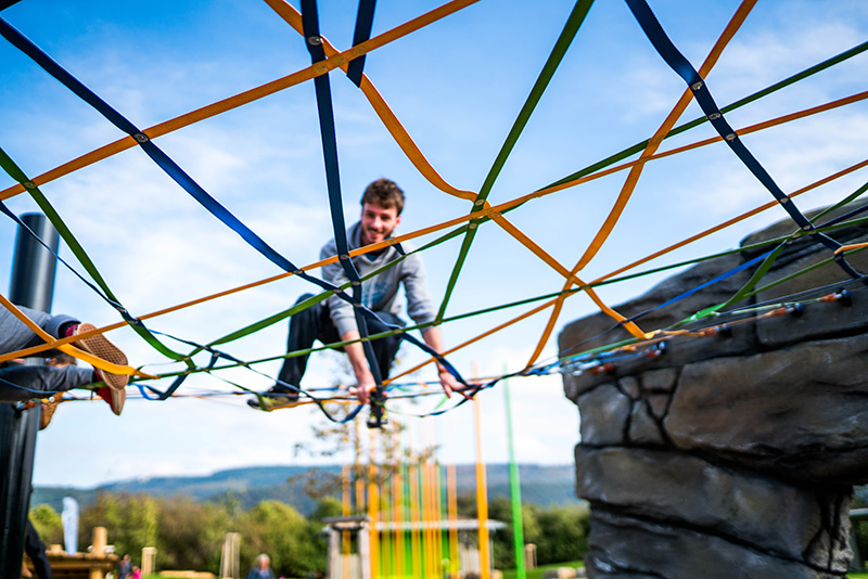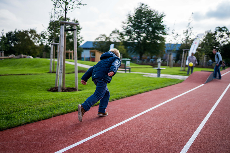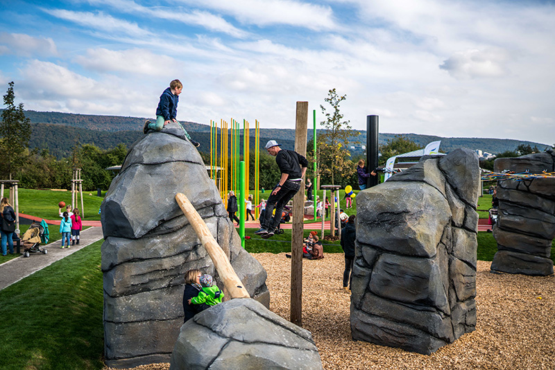 Eine besondere Attraktion ist die in Wellen gelegte Laufbahn: Sie bietet Sprung- und Schwunggelegenheiten und fördert dabei Koordination und Geschicklichkeit. Auch die Kletterfelsen, eine große Rutsche und ein eigens für die Anlage entwickeltes Kletternetz aus Slacklines bieten vielfältigen Spaß. Erbaut wurde die Anlage durch die Dietmar Hopp Stiftung. Die Planung der Anlage erfolgte durch das Büro Schelhorn Landschaftsarchitektur in Frankfurt.