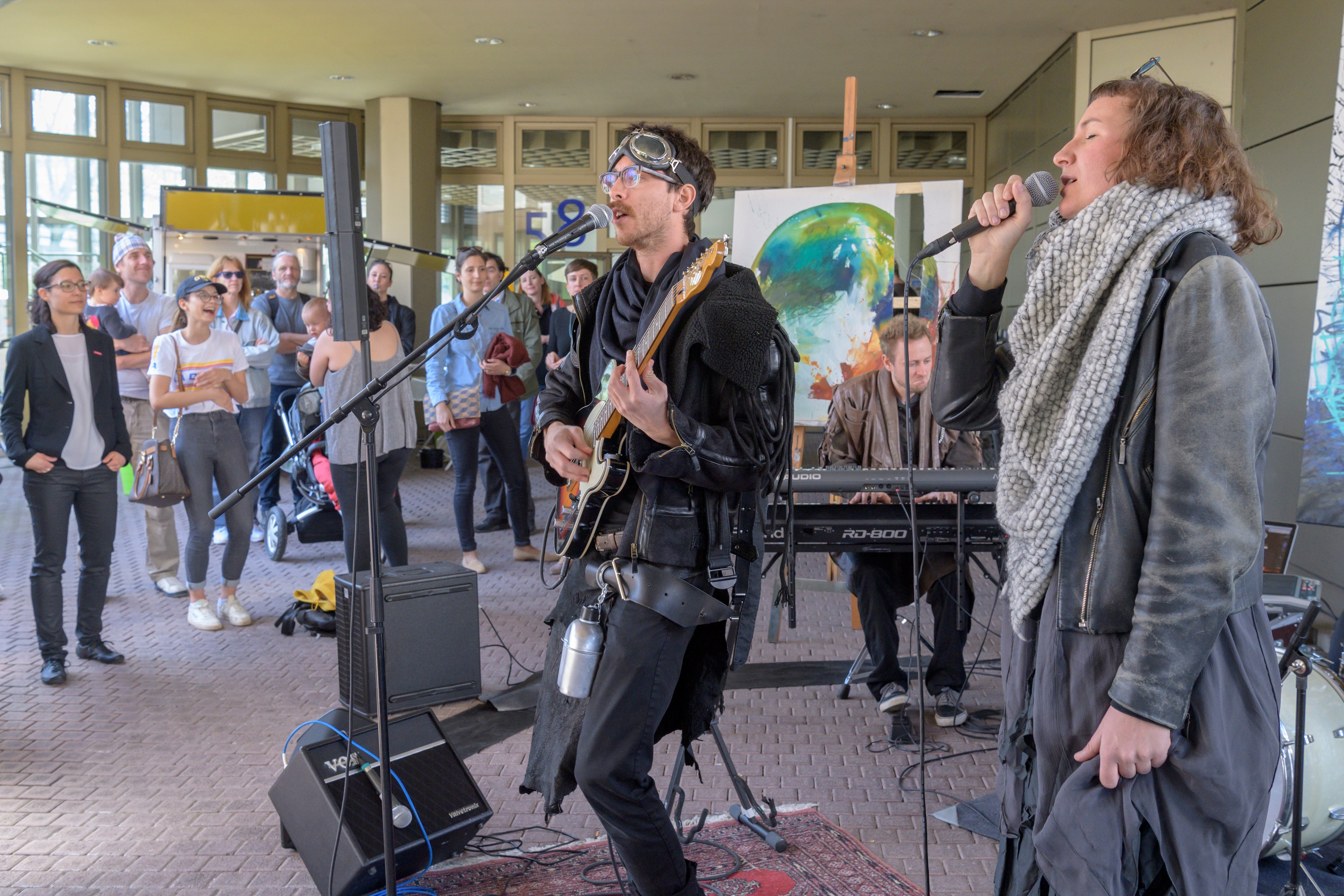 Aus dem Open-Air-Konzert wurde dabei ein musikalisch-künstlerisches Gesamtkunstwerk der besonderen Art: Zusätzlich zur Musik-Performance wurden die Songs visuell durch die Werke der Künstlerin Anna Baer alias Olive Green Anna untermalt. Darüber hinaus traten die Musiker*innen in Kostümen der Heidelberger Modedesignerin Katharina Andes auf. Das Projekt von Dominik und Anna Baer für das Jahr 2018 ist geglückt: in zwölf Monaten zwölf Lieder, zwölf Videos und zwölf abstrakte Gemälde zu produzieren. Beim FensterLunch konnten sich 150 Besucher*innen bereits vom Erfolg der 10 Projektidee überzeugen.