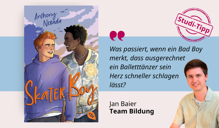 In Skater Boy geht es um Wes, den typischen Bad Boy, der eigentlich alles im Griff hat, zumindest nach außen. Als er durch das Abschlussjahr fällt und widerwillig bei einer „Nussknacker“-Aufführung landet, trifft er dort auf Tristan, den Star der Bühne. Zwischen Skatepark und Ballettsaal entsteht eine Verbindung, die beide herausfordert. Wes merkt schnell, dass sein Ruf, seine Clique und seine einstudierte Coolness vielleicht gar nicht zu ihm passen. Durch die neue Freundschaft, fängt er an, anders über sich, seine Zukunft und die Menschen um ihn herum nachzudenken. Das Buch erzählt locker, modern und nahbar von Selbstfindung, queerer Identität und dem Mut, aus einer Rolle auszubrechen, die man sich nie ausgesucht hat. Eine Geschichte über zweite Chancen und darüber, wie ein einziger Mensch alles verändern kann.