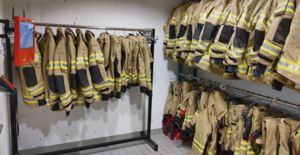Im Kleiderlager sind für Berufs- und Freiwillige Ersatzeinsatzjacken- und Ersatzüberhosen gelagert.