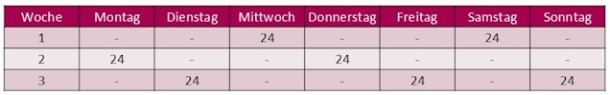 Nach diesem Modell versieht eine Wachabteilung zwei Wochen jeweils zwei 24-Stunden-Dienste, in der dritten Woche dann drei 24-Stunden-Dienste.