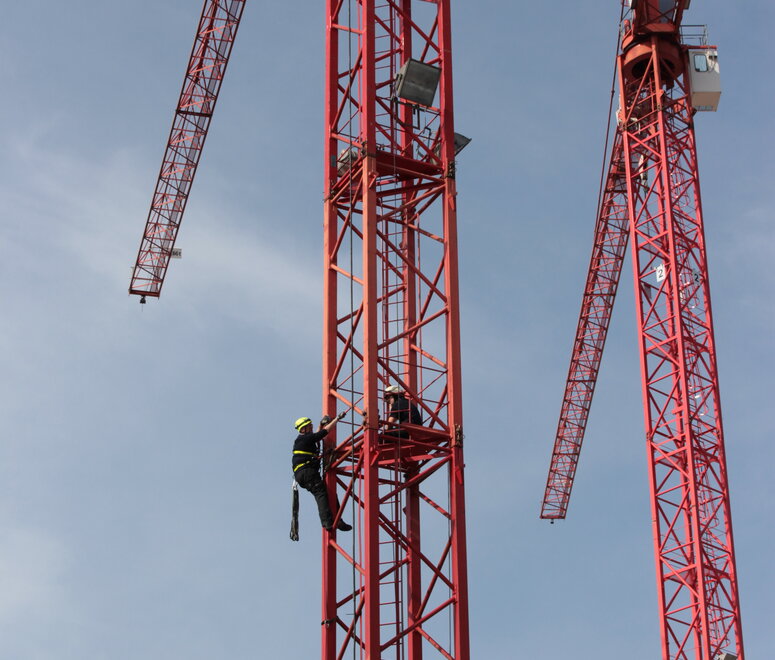 Am vergangenen Samstag hatten die Ausbilder eine besondere Übungseinheit parat: auf einem Baukran konnten die Lehrgangsteilnehmer in luftiger Höhe den Vorstieg üben.