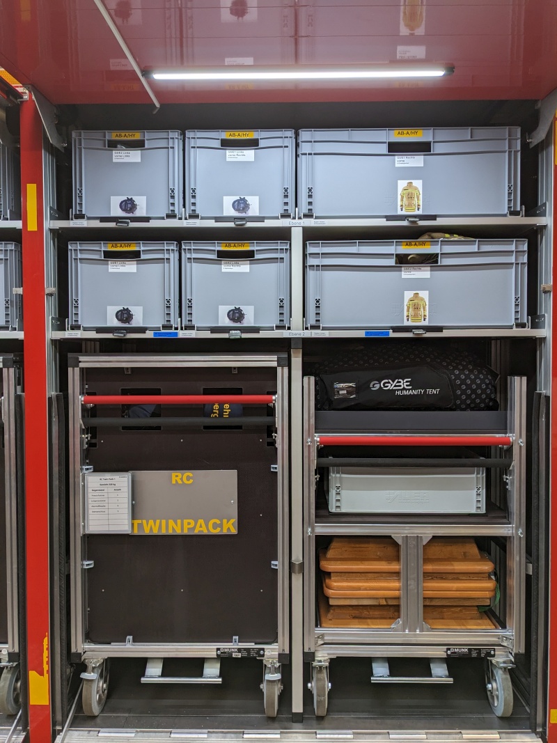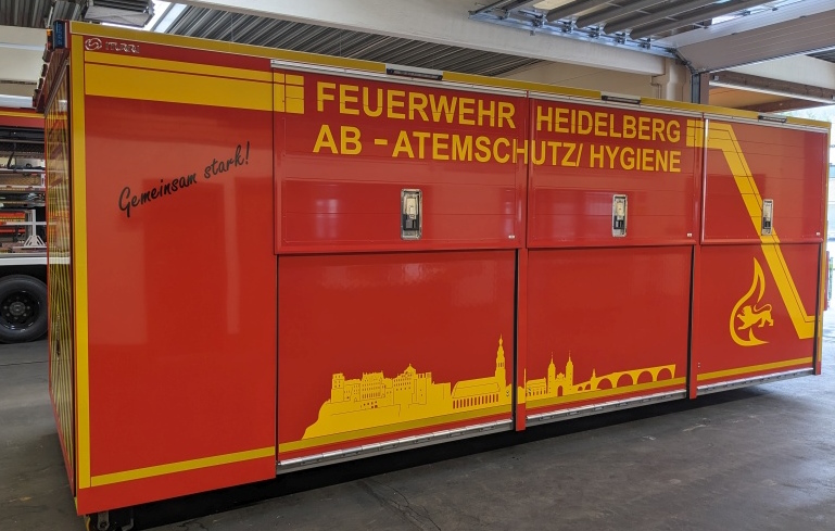 Der Abrollbehälter Atemschutz dient der Lagerung von Reserveatemschutzgeräten und Atemschutzmasken der Feuerwehr Heidelberg.