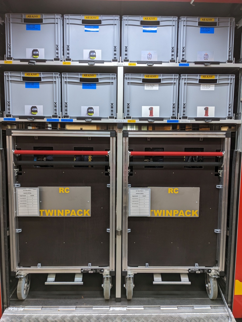 Neben einzelnen Sauerstoffflaschen zum Tausch auf bereits genutzten Geräten, sind weitere 48 Atemschutzgeräte, davon 18 sogenannte PA-Lang Geräte verlastet.