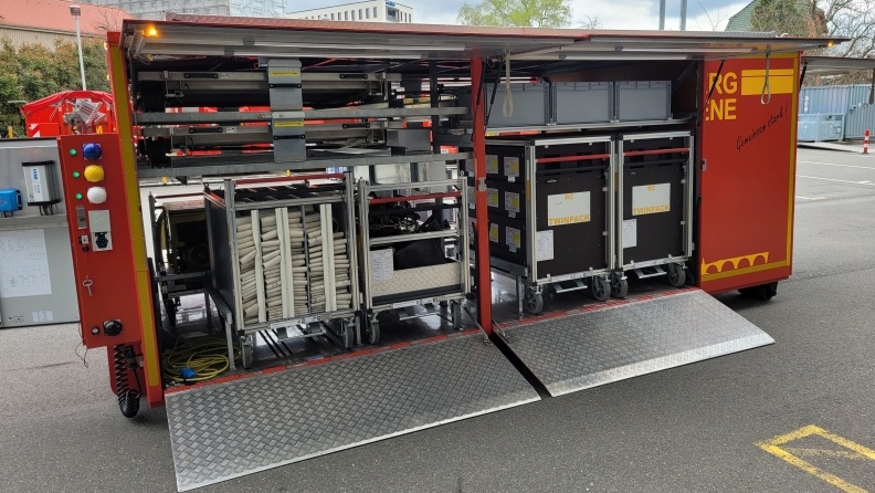 Auf dem Abrollbehälter Tunnel/Schiene wird Ausrüstung mitgeführt, die speziell für Brände in unterirdischen Verkehrsanlagen