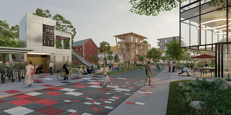 Zentrale Erschließungsachse im Stadtteil wird eine Ringstraße sein, die die verschiedenen Quartiere und Freiräume verbindet und eine Stadt der kurzen Wege schafft. Das Straßensystem wird stellplatzfrei geplant. Alle Grundstücke sind mit dem Auto erreichbar, geparkt wird jedoch in den separat erschlossenen Quartiersgaragen an den Eingängen des Stadtteils. Wie in den Quartiersgaragen soll auch auf Quartiersebene in einzelnen Mobilitätsstationen ein nachhaltiges Mobilitätsangebot wie Leihfahrräder, Lastenfahrräder, etc. bereitstehen.