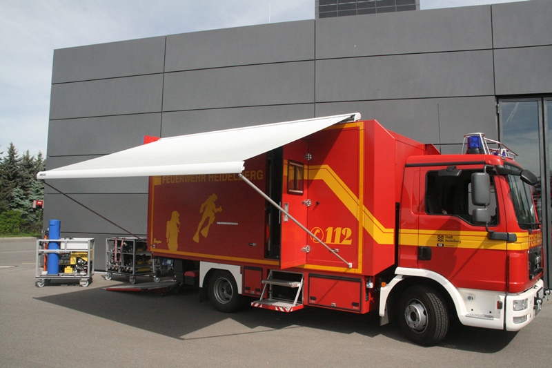 An der Einsatzstelle kann entlang des Aufbaus eine Markise als Wetterschutz ausgefahren werden. Breite, beim Öffnen der Mannschaftstür pneumatisch ausfahrende Tritte erleichtern den Ausstieg der Taucher.