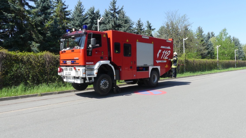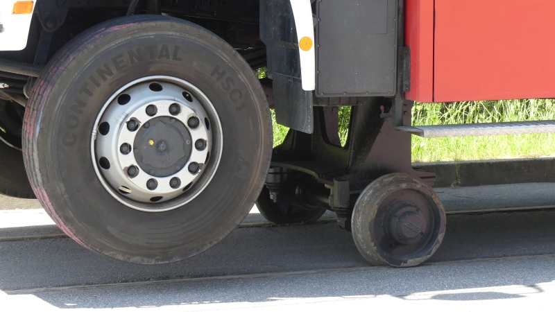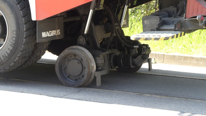 Hierzu verfügt dazu Fahrzeug über einen hydraulischen Schienensatz, mit dem es an einer geeigneten Eingleisstelle (z.B. Bahnübergang oder in Fahrbahn eingelassene Gleisanlagen) auf die Schienen eingegleist werden. Das Fahrzeug fährt dann die Einsatzstelle rückwärts an.