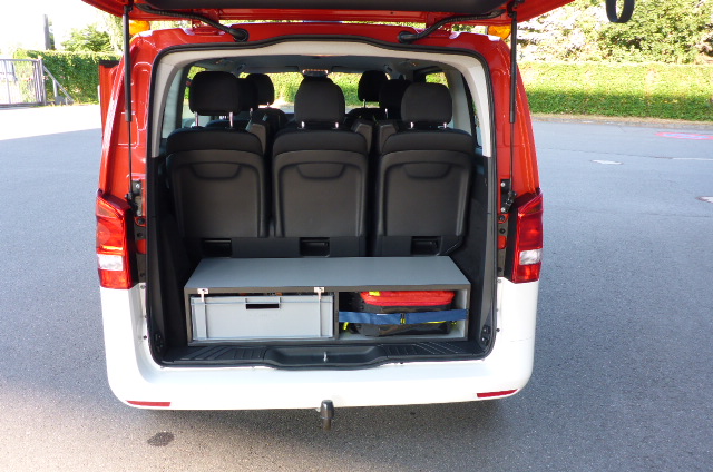 Der MTW dient vornehmlich dem Transport von Einsatzkräften und bietet hierfür 9 Sitzplätze sowie eine kleine Staufläche im Fahrzeugheck.