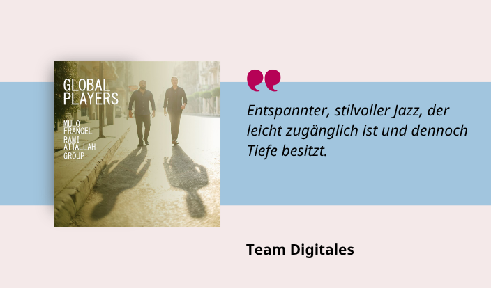 Die CD “Global Players” von Mulo Francel verbindet eleganten Jazz mit weltmusikalischen Einflüssen. Gemeinsam mit dem ägyptischen Pianisten Rami Attallah entstehen lyrische Stücke mit mediterranen und arabischen Klängen. Francels warmer Saxofonton erzeugt eine ruhige, atmosphärische Stimmung. Entspannter, stilvoller Jazz, der leicht zugänglich ist und dennoch Tiefe besitzt.