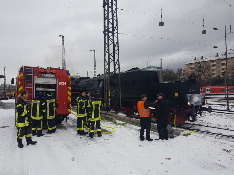 Eine nicht alltägliche Anfrage erreichte die Feuerwehr Heidelberg in der vergangenen Woche: Der Verein „Historischen Eisenbahn Frankfurt e. V.“ veranstaltete am Sonntag, dem 10. Dezember 2017 eine Fahrt mit einer Dampflok Baureihe 52 aus dem Jahre 1943 von Frankfurt am Main nach Heidelberg. Da die Infrastruktur für den Betrieb von Dampfloks in Deutschland flächendeckend zurückgebaut wurde, bat man die Feuerwehr um Unterstützung bei der Befüllung der Lok mit dem zum Betrieb notwendigen Wasser.