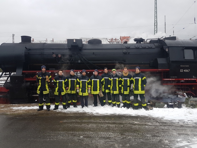 Nach getaner Arbeit besichtigten die Kameraden die Dampflok sowie den Arbeitsplatz des Heizers und des Lokomotivführers. Bei letzterem konnten sich die Einsatzkräfte angesichts der frostigen Temperaturen kurz aufwärmen, bevor die Lok wieder Richtung Frankfurt abfuhr.